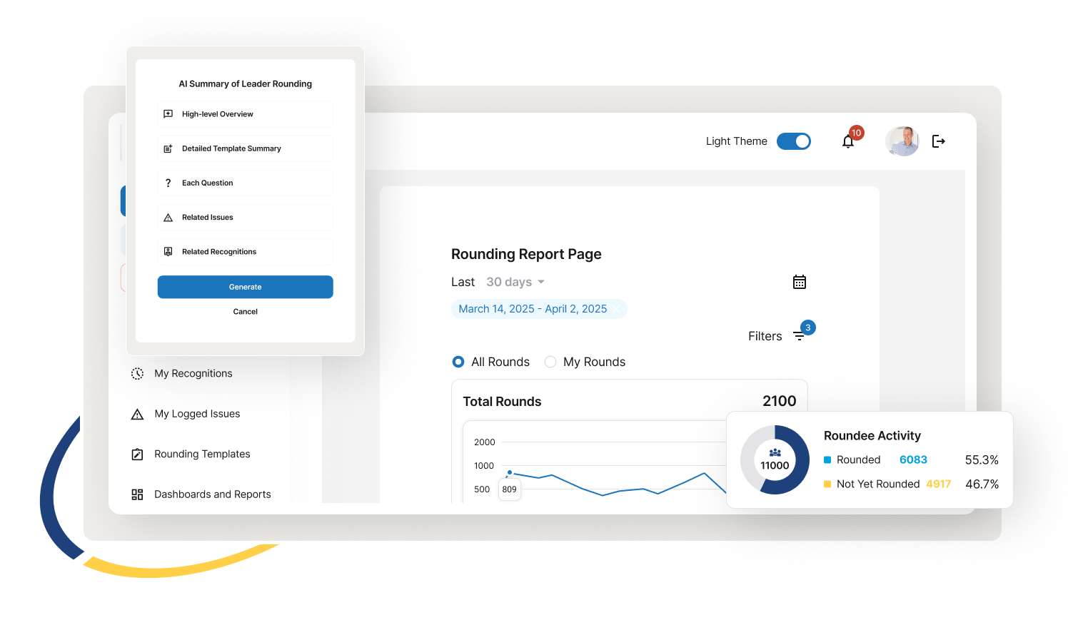 Track rounding activity, overdue follow-ups, recognitions, and engagement trends all in one place.
